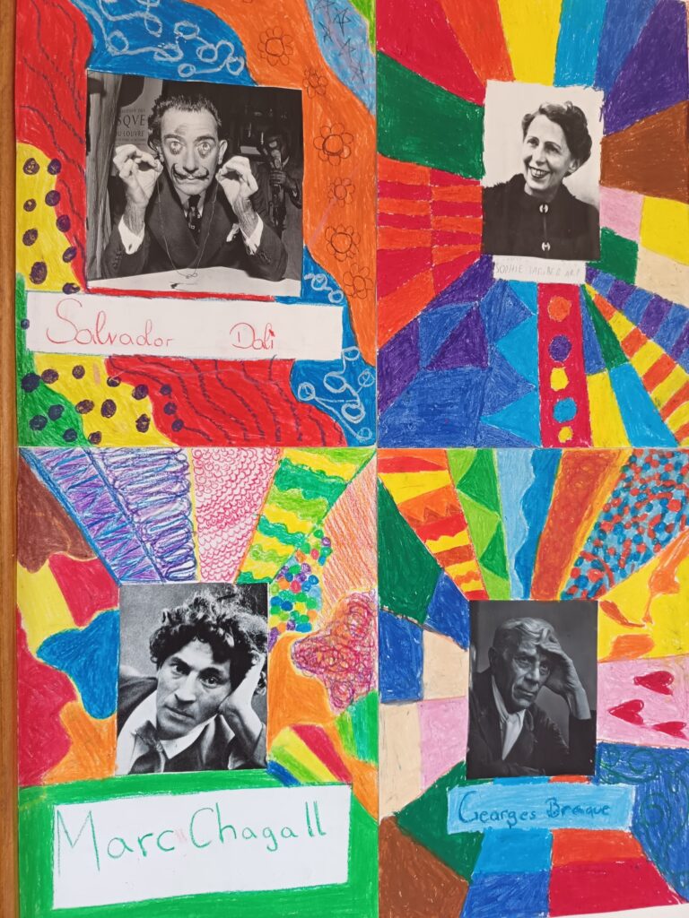Die Klasse 3b hat sich im Kunstunterricht mit verschiedenen berühmten Künstlern beschäftigt, darunter Pablo Picasso, Claude Monet und Salvador Dalí.
